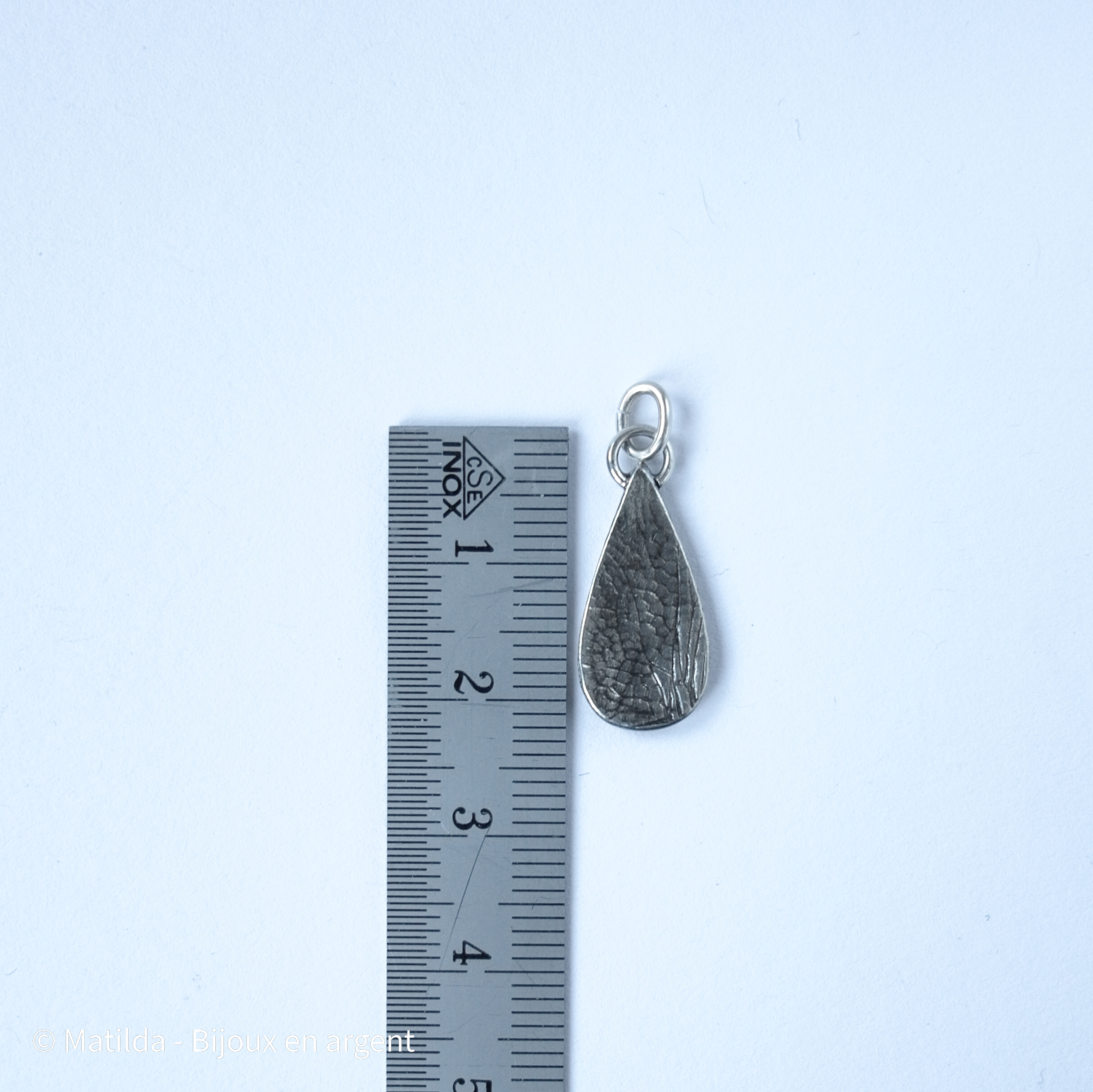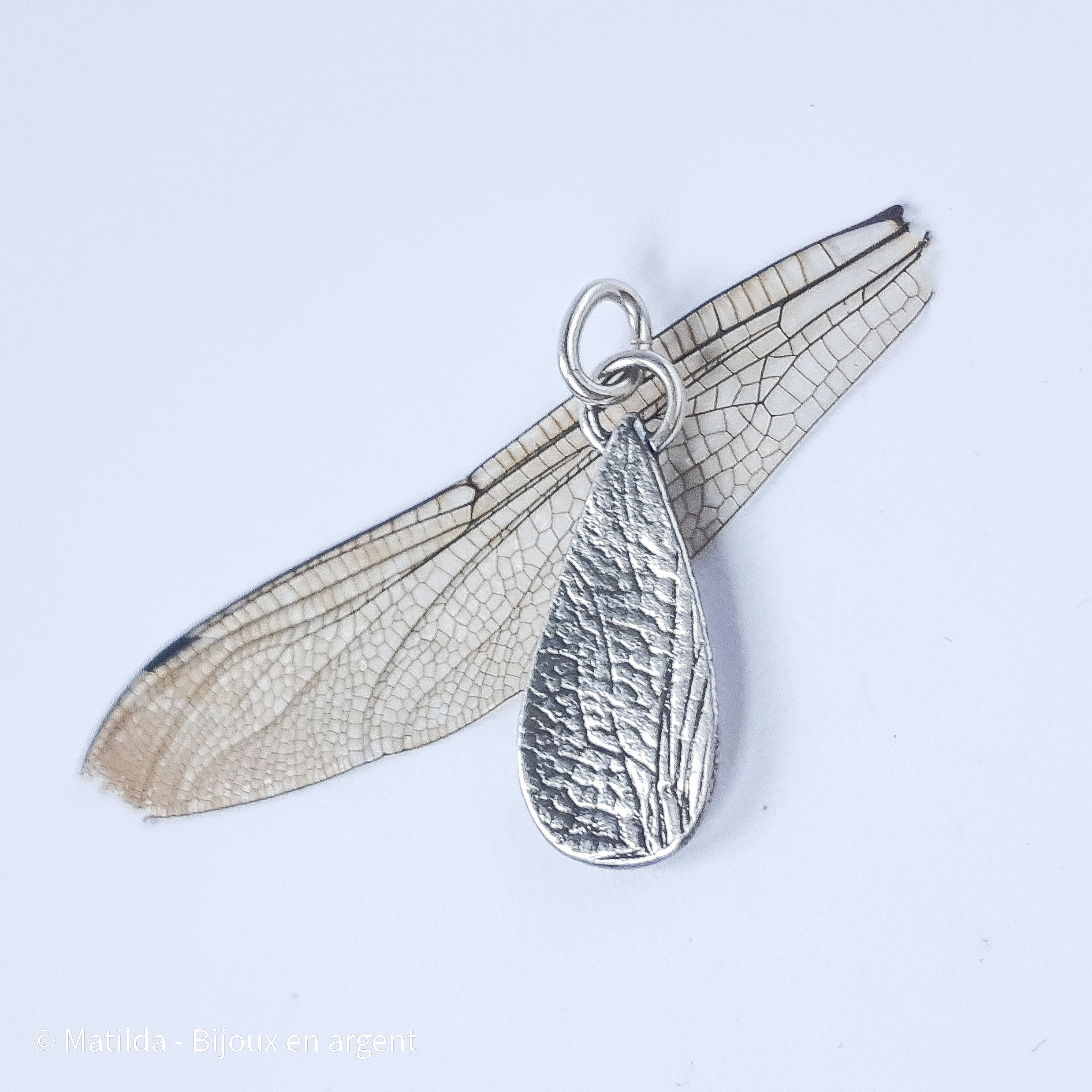 Les nervures sur ce pendentif sont les empreintes d’une vraie aile de libellule, trouvée près d’un étang.